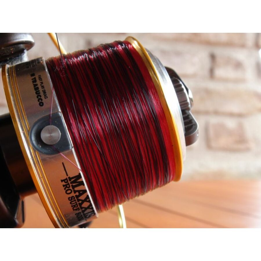 The thickened "shock leader" section is black, and the main line is ruby red, which is invisible underwater.