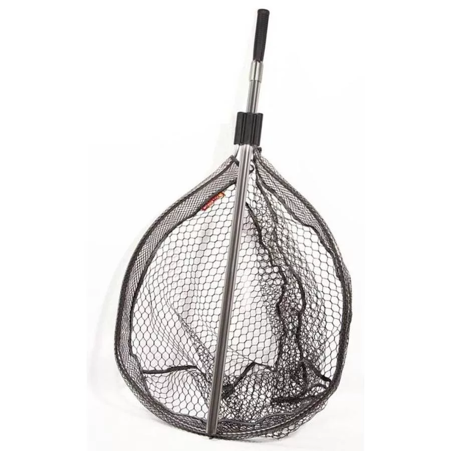 Large-sized, feather-light, yet very sturdy rubberized landing net with a telescopic handle, sized for large fish. The net mesh size is 2/3 cm, the head is 65 cm long and 55 cm wide. The telescopic aluminum handle length is 85/155 cm, the handle diameter is 25 mm. To facilitate transport, the handle can be inserted into the head, thus occupying less space.