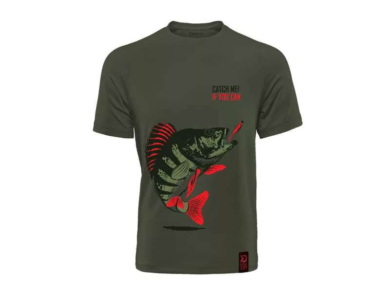 The Catch me! PERCH T-shirt is dark green, featuring a perch approaching the bait, which is every angler's dream.