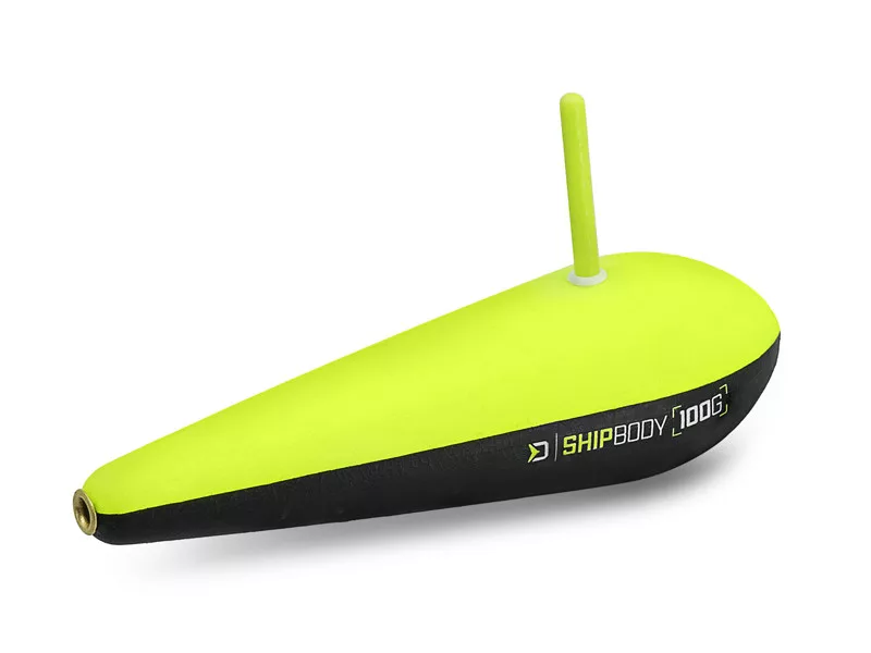 The Delphin CKG ShipBODY catfish float's boat shape makes it a perfect choice for river fishing. The design of the float body significantly reduces resistance to the river current, making movement more efficient compared to traditional floats. It also ensures the stable retention of the bait in the desired location. As part of the float body, there is a 4.5 mm diameter hole for the antenna, which can be replaced with a night light stick. The combination of fluorescent green and black colors ensures optimal visibility even in unpredictable conditions such as fog or intense rain.