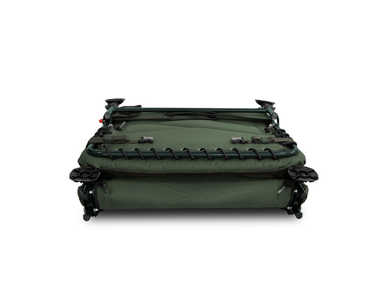 The bed's base is a stable and lightweight structure, which is also highly resistant to mechanical damage. The frame is covered with a thoroughly padded, quilted mattress, whose fleece surface is warm and soft to the touch. Additionally, it is covered with a durable 600D fabric with C2G design on its side. The headrest is green and features extra fleece padding for even greater comfort. The middle section is reinforced from below, and the mattress firmness can be adjusted with a rubber strap.