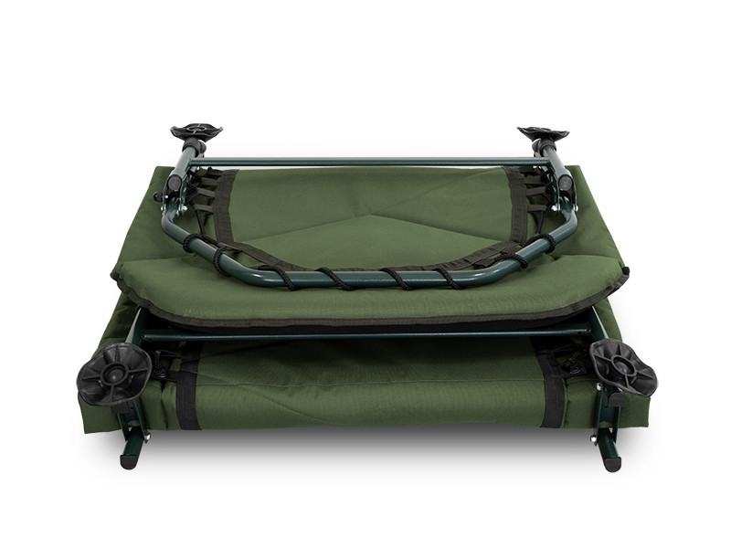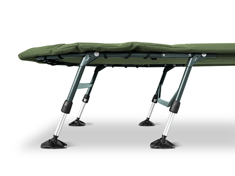 The base of the bed is a durable and lightweight green structure, and 8 legs ensure absolute stability. The legs are individually adjustable to suit different terrain conditions and have robust mud feet. The pair of legs under the headrest has a safety mechanism that easily unfolds the bed and prevents it from collapsing or shifting.