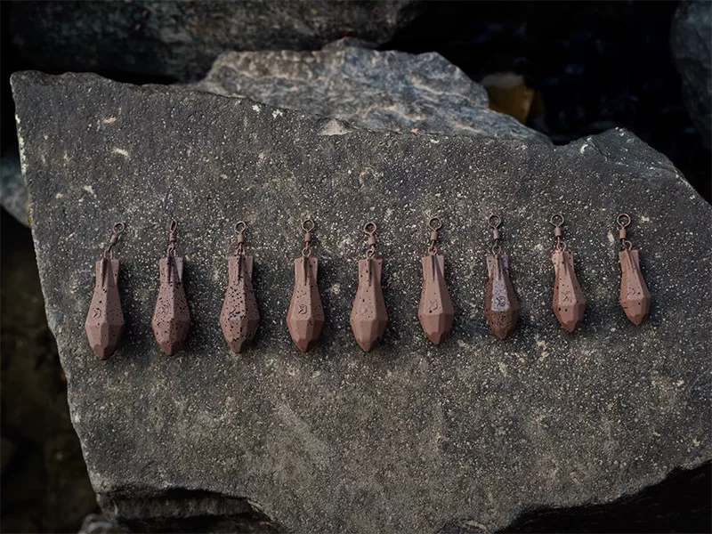 The aerodynamic shape of the teardrop form was designed to create the least possible resistance during casting. We replaced the round surfaces with sharper ones to place more material on the outer edges and create a smaller form. The side wings stabilize the weight during casting, thereby extending and making our casts even more precise and consistent. The surface of the weight is coated with a brownish color and decorated with black spots for better camouflage on the riverbed.