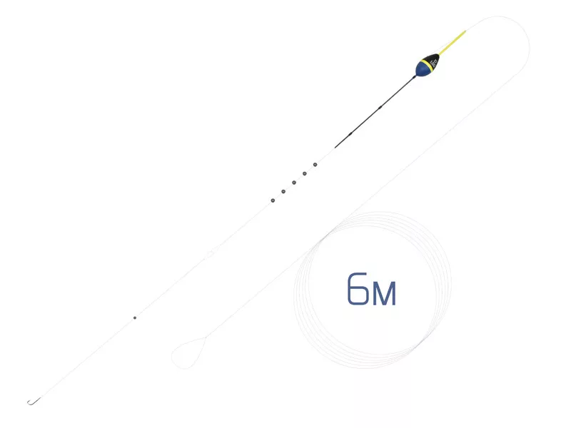 A pre-rigged, 6 m long ready-made rig designed for whip rod fishing, which includes a teardrop-shaped float weighing 0.5-3 g, weighted with split shot, and a hook.