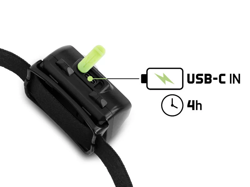 The headlamp is powered by a built-in 1200 mAh battery, which can be charged with a USB-C cable. A full charge takes approximately 4 hours. The lamp also has a charge indicator.