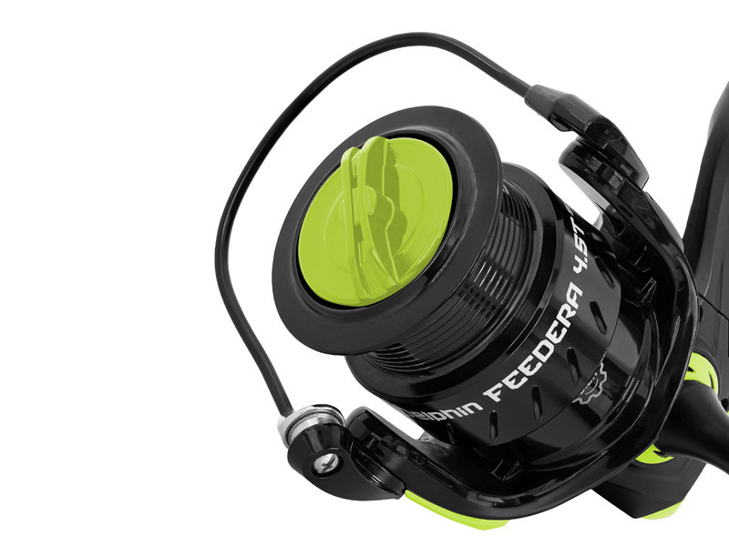 The reel features a perfect 4500 feeder reel size with a shallow spool, which still provides sufficient line capacity for longer casts. It has seven (6+1) ball bearings and a 5.2:1 gear ratio for quick, trouble-free retrieve of the rig. The strong front drag effectively stops fighting fish. The Feedera has an inox reel foot and a thick metal bail arm for greater durability and better performance. The handle is matte black and has a black rubber coating for a comfortable grip. The drag is strong and sensitive enough to fight fish using a delicate feeder rod. The matte black handle provides a comfortable grip. The green decorative elements give the reel a modern and sporty look. Line capacity mm/m: 0.20/250 m 0.22/210 m 0.24/175 m, Gear ratio: 5.2:1, Number of bearings: 6+1, Weight: 314g