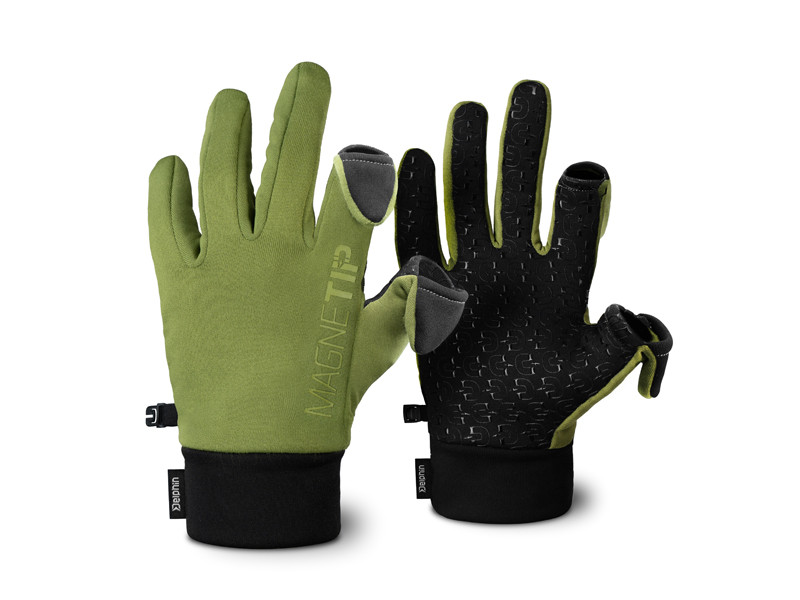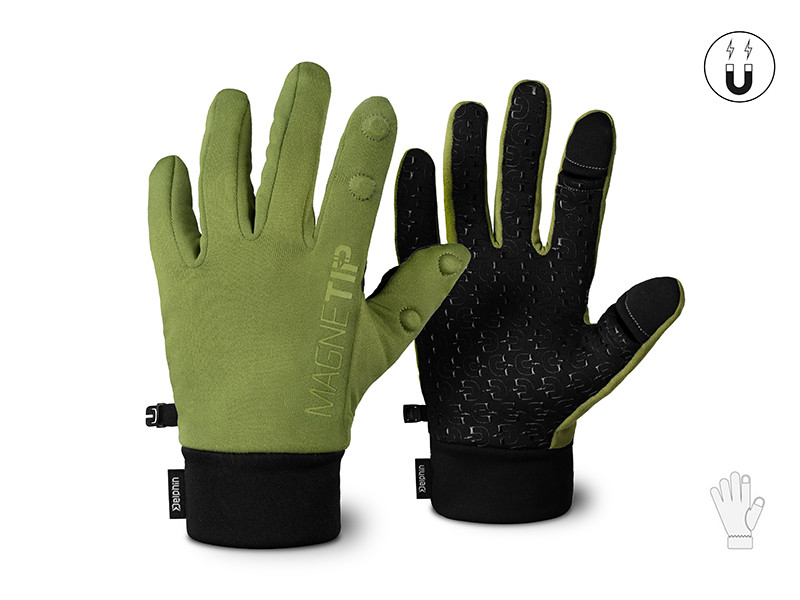 The MagneTIP glove features a double layer of fabric on the wrist for improved thermal insulation and a perfect fit. It is produced in green with black elements. A plastic clip is located on the side of both gloves, allowing them to be fastened together and kept in a bag for when you need them again.