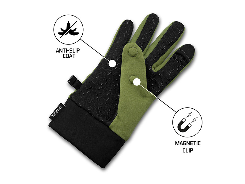 An extremely practical glove designed for fishing in colder seasons. The thumb and index fingertip are equipped with a fold-back fingertip. This folded-back fingertip can be secured with an innovative magnetic system sewn between two layers of fabric.