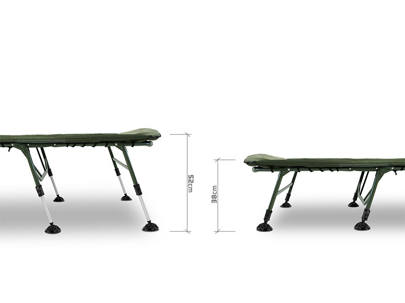 The Delphin ErgoCARP fishing bed represents a new level of waterside relaxation, where comfort, stability, and durability meet. The increased mattress size (215 × 80 cm) provides enough space even for taller anglers, while the 38 cm base height and telescopic legs can be adjusted up to 52 cm, allowing the bed to be stably placed on any terrain. The eight independently adjustable legs are equipped with wide, flexible feet that prevent sinking on soft ground and ensure stability on uneven surfaces.