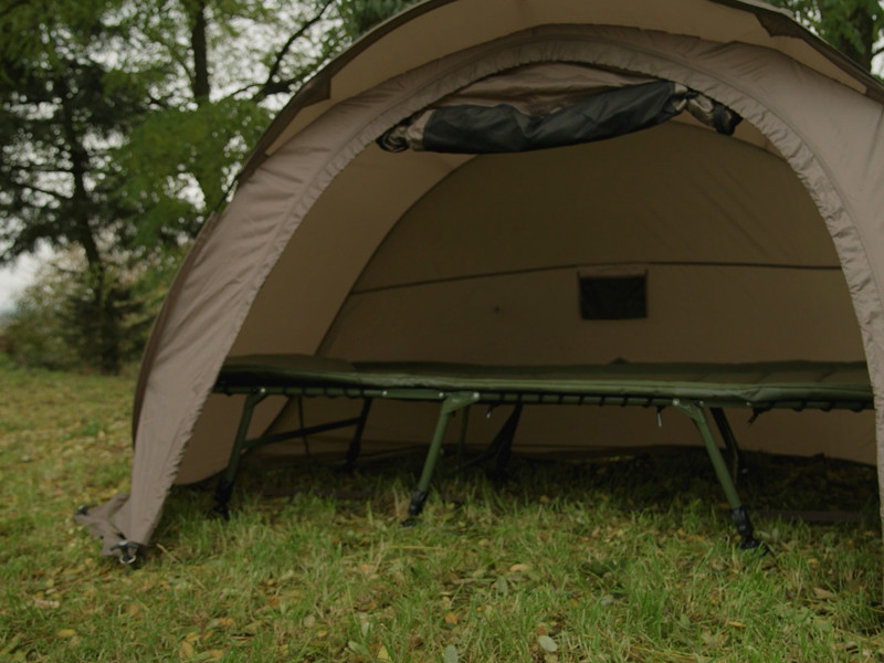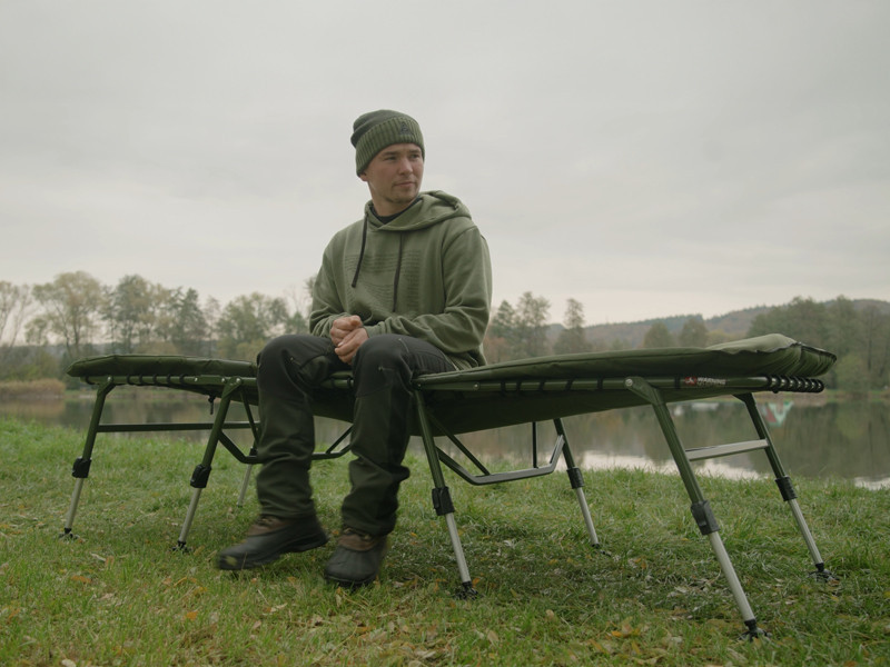 The fishing bed is built on a strong, heavy-duty metal structure that withstands intensive use, yet is lightweight and easy to transport. The leg pair locking mechanism at the headrest prevents unintentional folding, allowing for safe and quick setup. The entire surface of the mattress is covered with soft fleece, which is pleasant to the touch and provides a warm feeling on cool nights. The edge is protected by durable, olive-green 600D material, which resists wear and tear and guarantees a long lifespan.