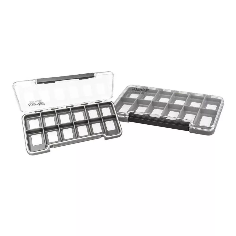 The box design includes twelve well-separated compartments, which allow for grouping lures by type, color, or size, enabling you to work quickly and efficiently while fishing. The transparent lid allows you to view the contents at a glance without opening the box – this is especially useful when time and concentration are needed to select the right lure. Due to its flat, easily portable shape, the box simply fits into a fishing bag, jacket pocket, or box system, so it is always at hand when you need it.