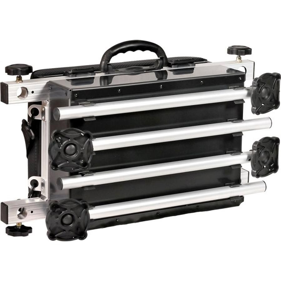 Because it is compact, easy to transport, and versatilely expandable, while providing a stable and comfortable workspace on any terrain.