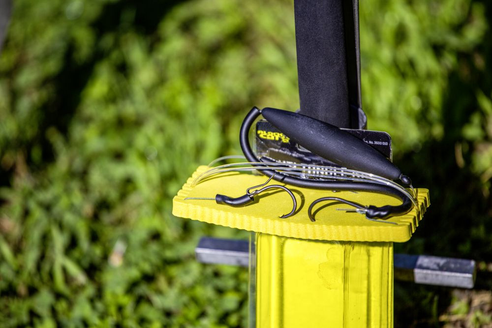 Stefan Seuß's Waller Spezial catfish leader. The Anti Tangle Rig ensures tangle-free bait presentation near the bottom in still and slow-flowing waters. A stiffer rubber tube is located between the U-Pose and the first hook, which acts as a spacer and prevents the bait from tangling. The Anti Tangle Rig is perfectly suitable for presenting baitfish and other live baits near the bottom. The single hook is fixed at the head of the baitfish, and the Ghosthook at the tail section, thus maximizing the hooking chance.