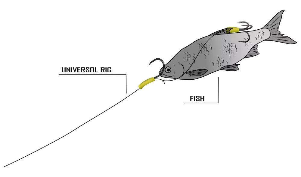 Stefan Seuß's Waller Spezial catfish leader. The Universal Rig is a perfect solution for presenting baitfish and natural baits for buoy, float, and bottom fishing methods. The leader consists of a single hook and a treble hook, and is quick and easy to deploy.