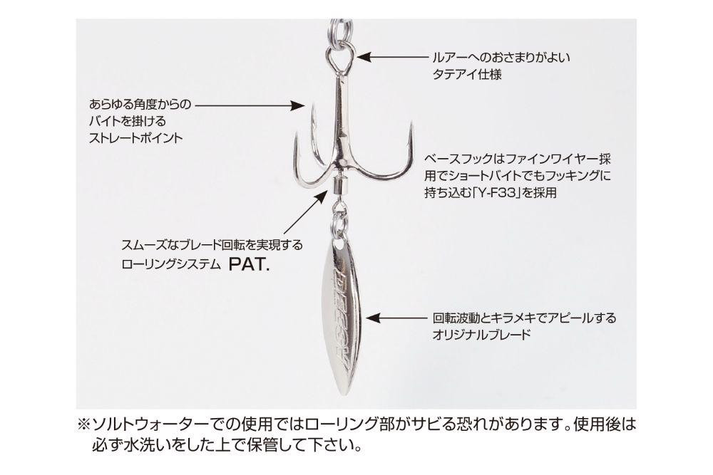 The Spinner Blade design is particularly effective during spinning, helping to optimize the movement and attractiveness of the baits in the water. Choose the Decoy Y-F33BT treble hook and experience the difference in the number of bites!