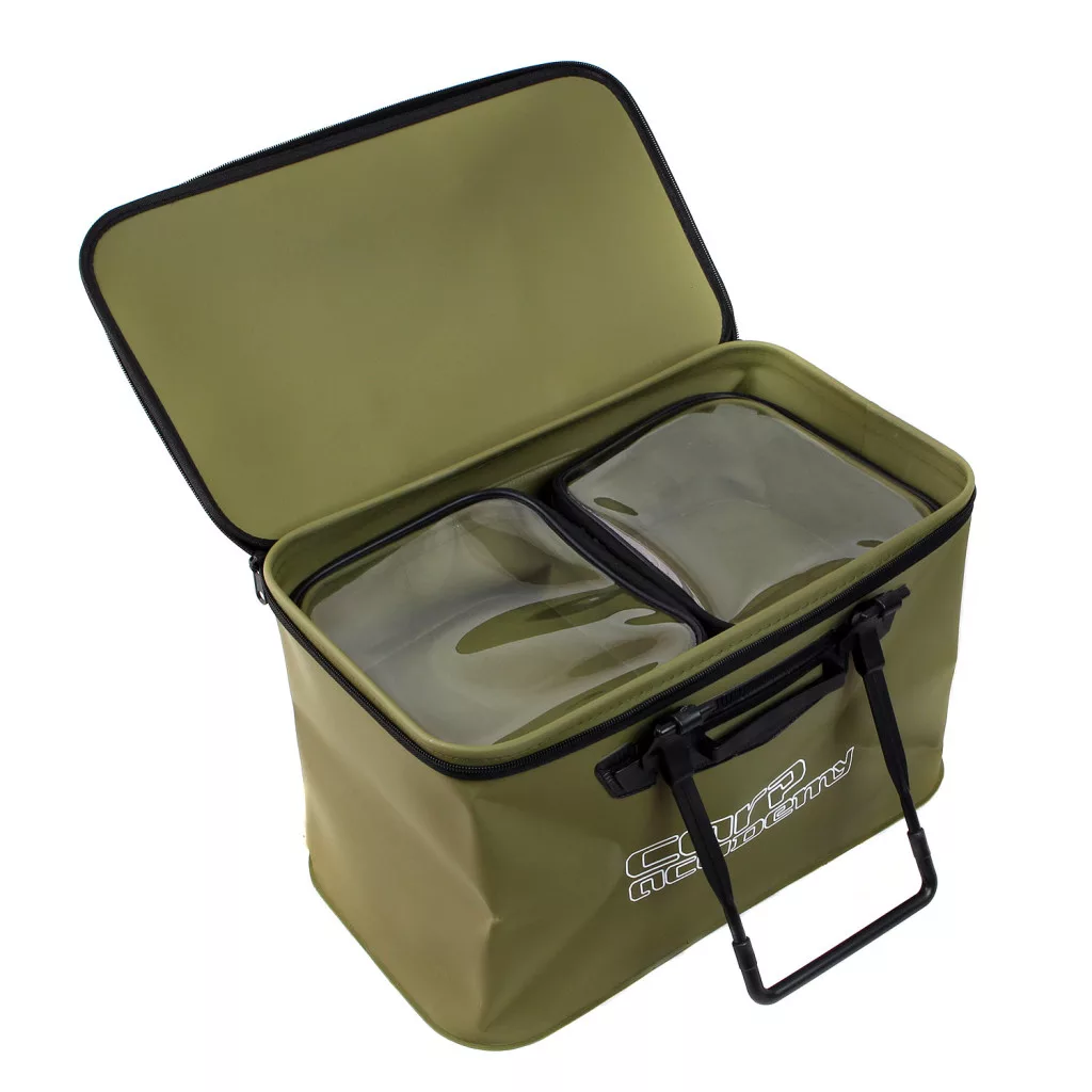 The Carp Academy EVA Storage Bag is designed to meet the needs of carp anglers, providing an ideal solution for organized storage of smaller accessories, rigs, and baits. This EVA tackle bag stands out among storage devices with its robust design and practical features, helping anglers transport their equipment transparently and safely to the waterside. Its green color aesthetically fits the general palette of fishing equipment.