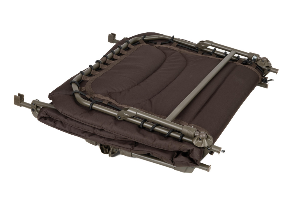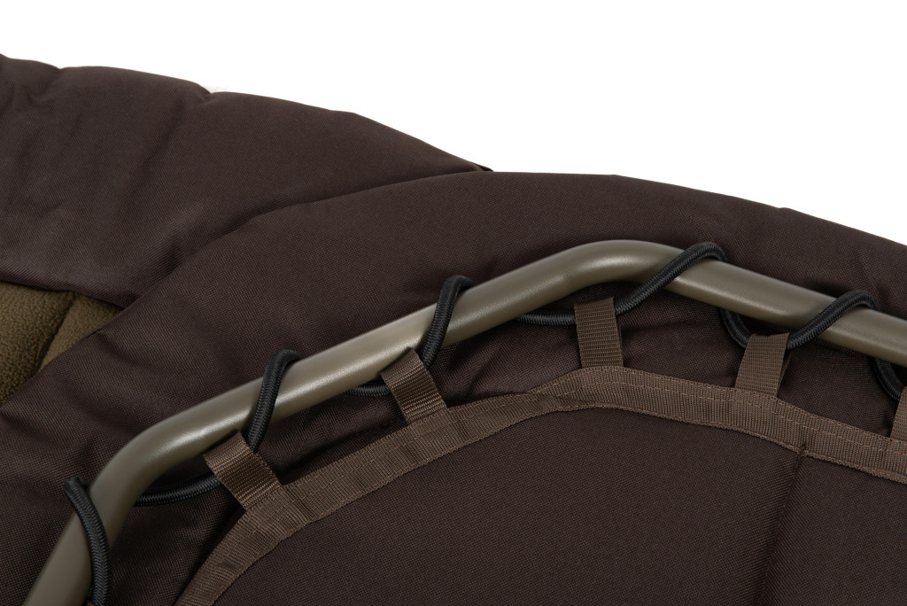 The Fox EOS Bed Standard comes in a khaki and dark khaki color combination, providing a natural look that blends well into the fishing environment. The knob-free design provides greater usable width, making the sleeping surface more spacious and comfortable than traditional solutions. The flat frame design and padded foam mattress together ensure maximum comfort, even during longer fishing trips.