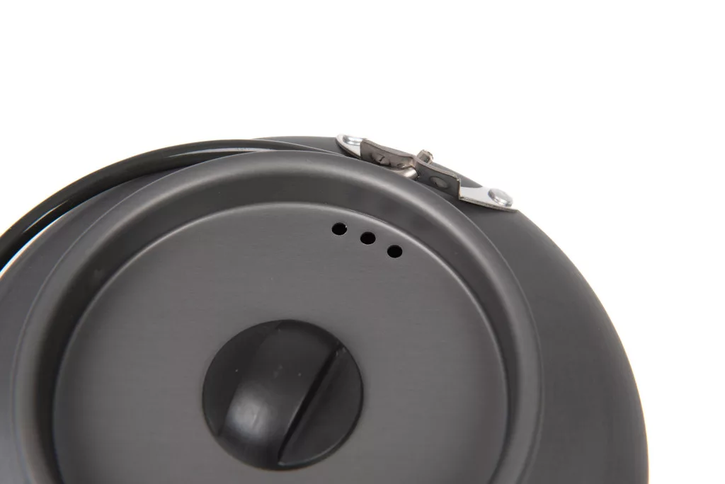 The kettle is made of hard, anodized aluminum, which is extremely lightweight yet durable. The anodized surface is wear-resistant and corrosion-free, ensuring reliable long-term use. Thanks to Heat Transfer technology, the kettle operates up to 30% more efficiently than traditional models. This means less time and energy are needed to boil water, which is particularly advantageous during fishing when you want to quickly prepare a hot drink or meal.
