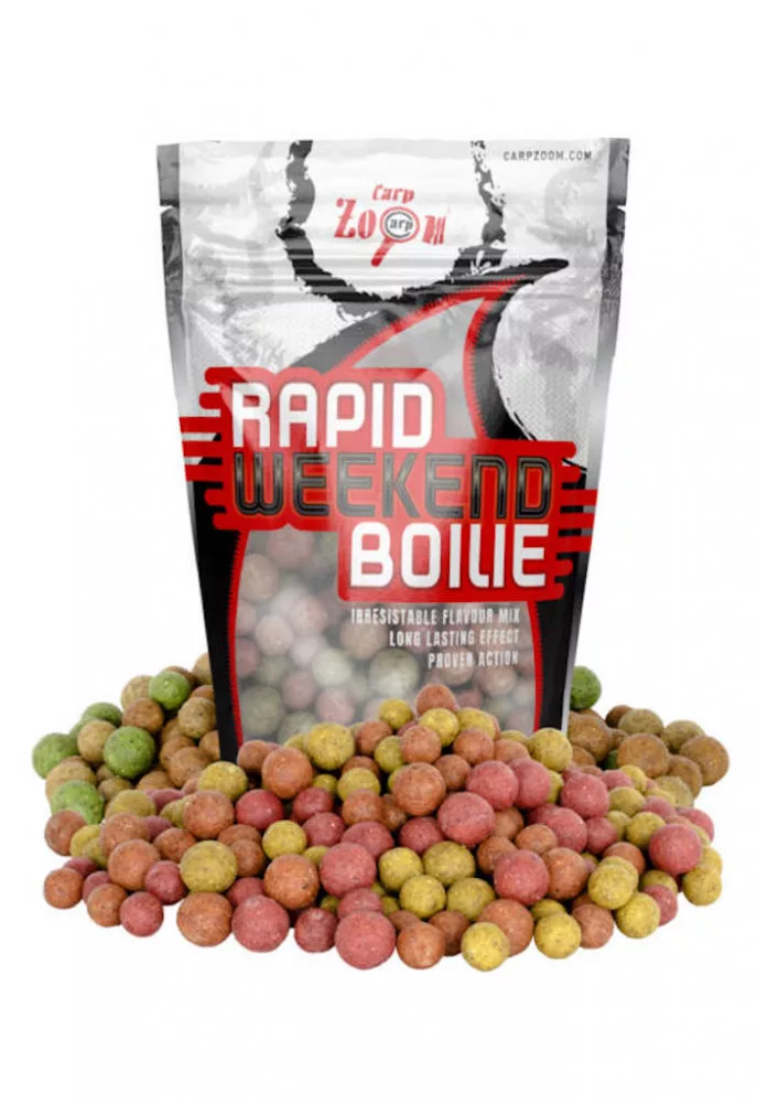 rapid weekend boilies Fast-acting boilie Boilies for feeding, but also usable under the hook due to their quality, for anglers who spend shorter periods, such as a weekend, by the water, thus a fast-acting boilie is essential for successful fishing. Available in optimal 2.5 kg packaging, at an unbeatable price. Multiple flavors and sizes can be found in one package.