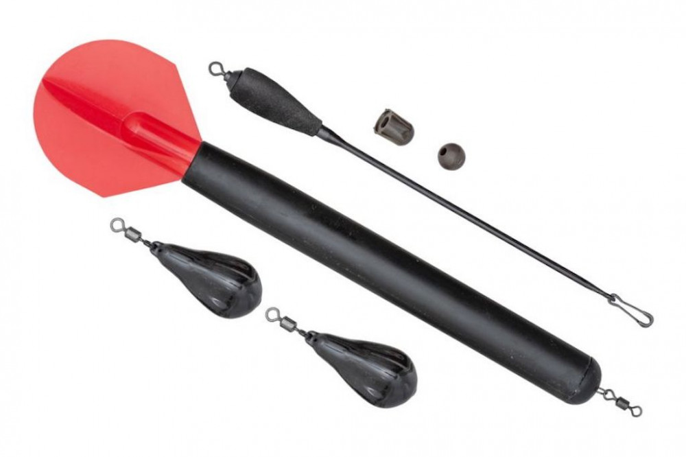 Fully equipped marker float set, which includes two drop-shaped leads, rubber stoppers, and a line holder for muddy bottoms, in addition to the marker. One end of the latter is lightened, lifting the line from the bottom, preventing it from sinking into the mud with the lead, so the line can pass through it without resistance.