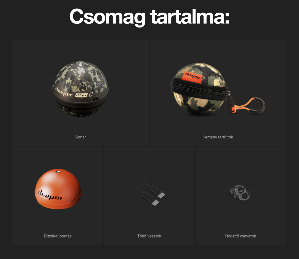 Deeper CHIRP+ 4 smart fishfinder (sonar), premium protective hard case for safe transport, night (glowing) cover for dawn or night fishing, USB-C fast charging cable, 2 durable fastening screws, quick start guide, and safety information.