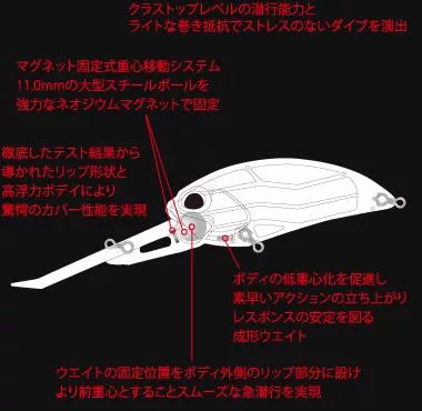 This excellent diving capability is due to the deep-diving crankbait's most advanced weight transfer system, which will soon be used in professional bass fishing competitions. The G87's enlarged magnetic ballast system keeps the casting bearing hidden outside the body cavity, where a Neodymium magnet holds it. This material is much stronger than ordinary magnesium and is essential for the large-sized bearing.