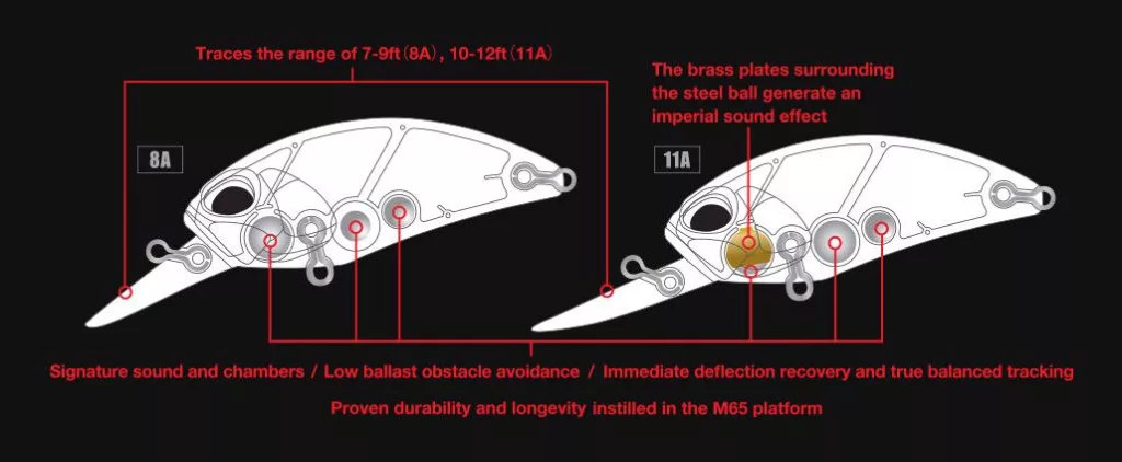 The M65 has unparalleled movement. It offers tight vibration and significant water displacement. Its low water resistance coefficient allows the lure to move in balance in water and air without generating excessive line tension. Additionally, it has a sharp diving angle that helps it quickly reach the specified depth. The M65 8A dives to 9 feet (2.7 m), while the M65 11A dives to 12 feet (3.6 m) with minimal effort.