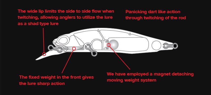 Furthermore, the lure can also be used as a shad-type bait, with panic-like darting movement, which can be achieved by gently moving the rod. This allows anglers to get bites from bass even at the shortest distances. This lure is a perfect choice for linear, straight retrieves, and also for 'spot-light' type fishing, aiding angling with its panic-like darting movement.