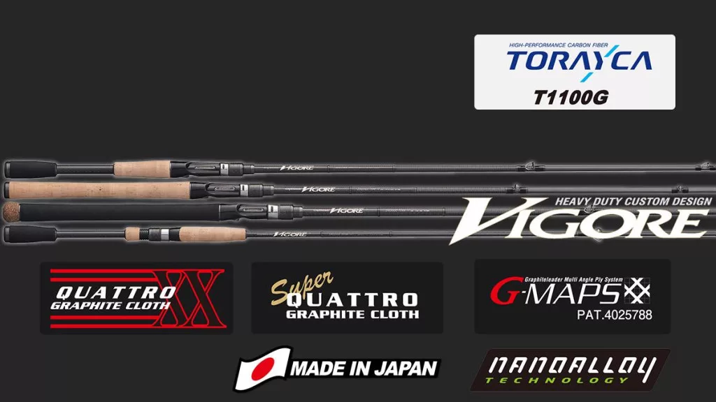All models use Toray 'TORAYCA® T1100G' throughout their entire length. Low to high elasticity carbon fibers are applied in the appropriate places to achieve a lightweight, well-balanced, ideal action. The handle section is made using the 'G-MAPS manufacturing method (PAT.)' and 'Quattro Graphite Cloth XX' to provide a strong, stable action. (The 20GVIGC-77XH also uses 'Super Quattro Graphite Cloth'.)
