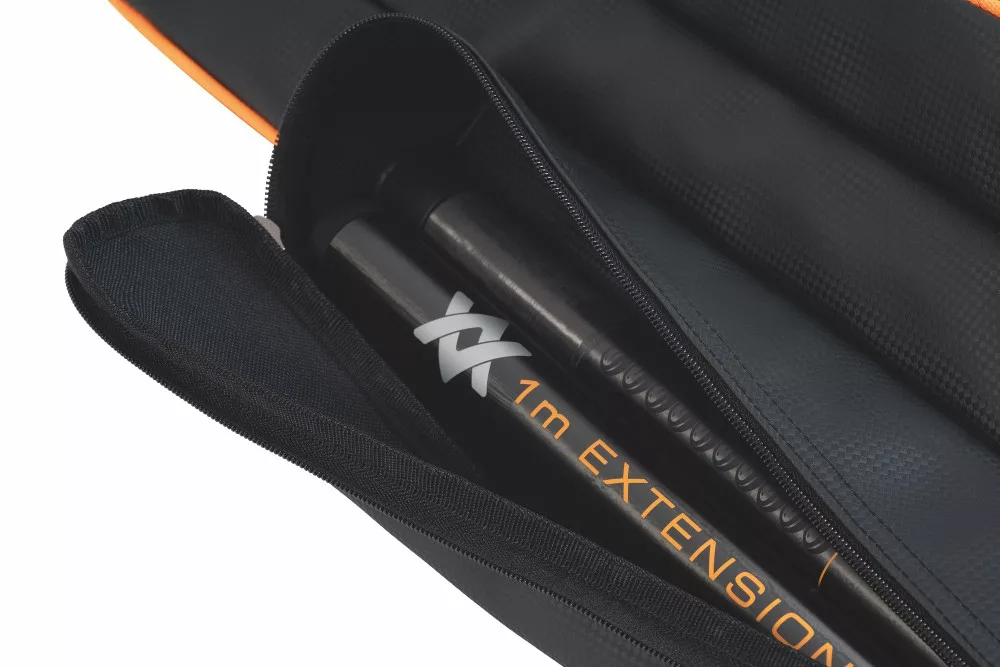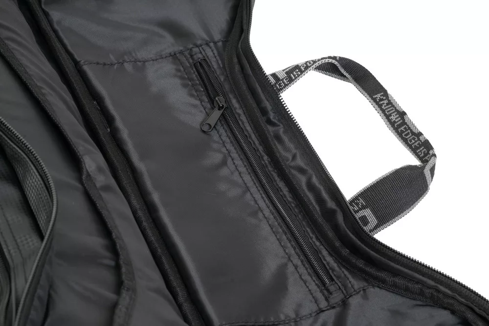 Each holder features compartmented sections (5 on the 10+), each with separate padded dividers to provide maximum protection for the rod and reel. Along with two external pockets specifically designed for storing items such as net handles, accessory arms, distance sticks, bait umbrellas, etc. The space between the two pockets perfectly supports a large umbrella, designed to fit into a pouch at the bottom of the bag and then secured in place with the carrying handle.