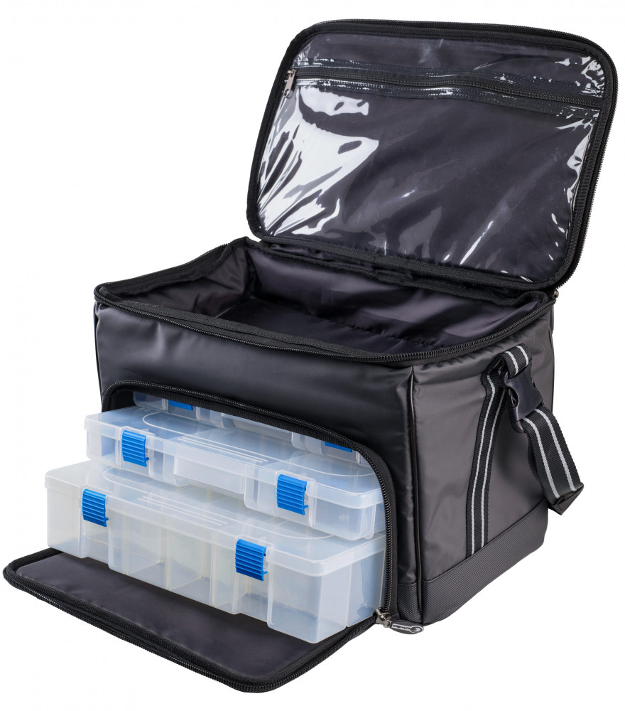 The bag offers numerous storage options, among which the front zippered pocket, behind which three plastic tackle boxes are located, and the larger capacity top pocket are noteworthy. The bag features an internal tubular frame, designed to maintain the bag's shape after the boxes are removed. The tackle bag's material is a special PVC 'Heavy Duty' fabric, which is 100% waterproof! For durability, the bottom, handles, and shoulder strap have also been reinforced.