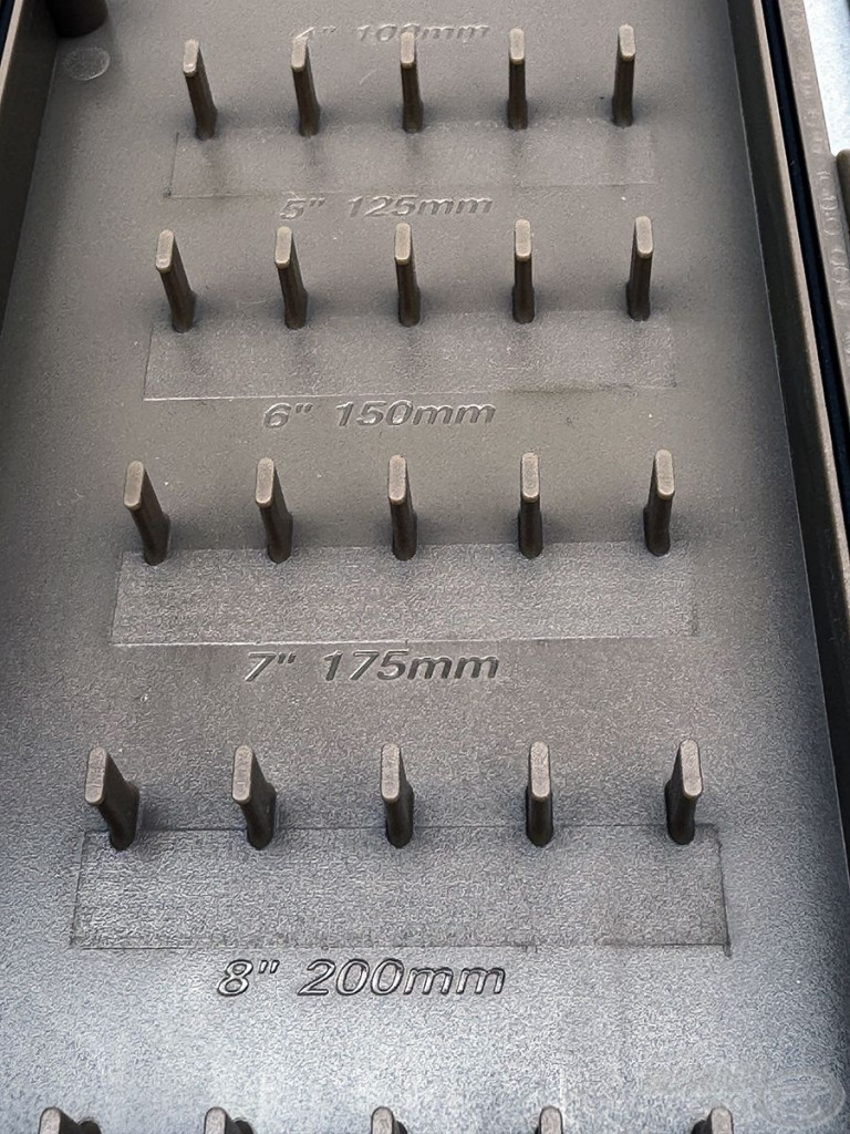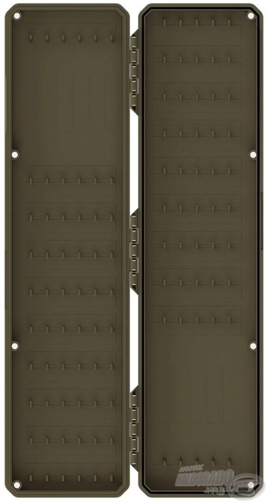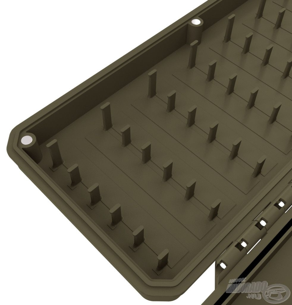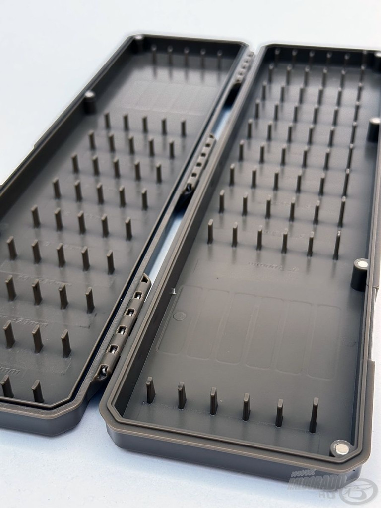 The internal layout of the rig holder allows for the attachment of various lengths of hook rigs, with precise placement aided by fixing pins and size markings. The lid closes with eight strong magnets, thereby waterproofly protecting the hooks from rust and contamination.