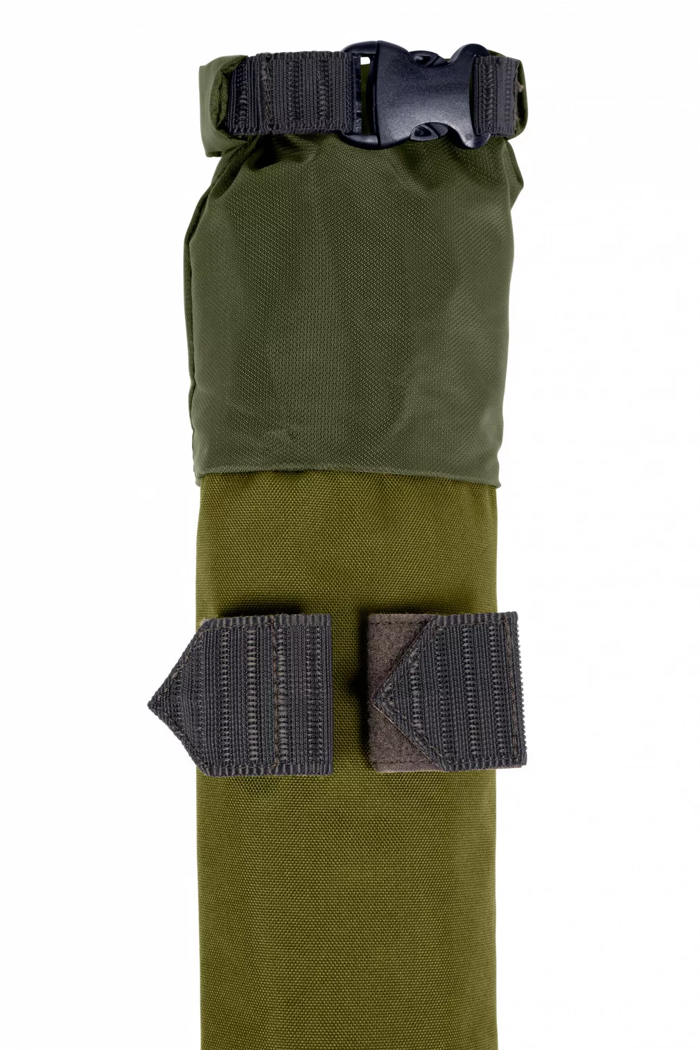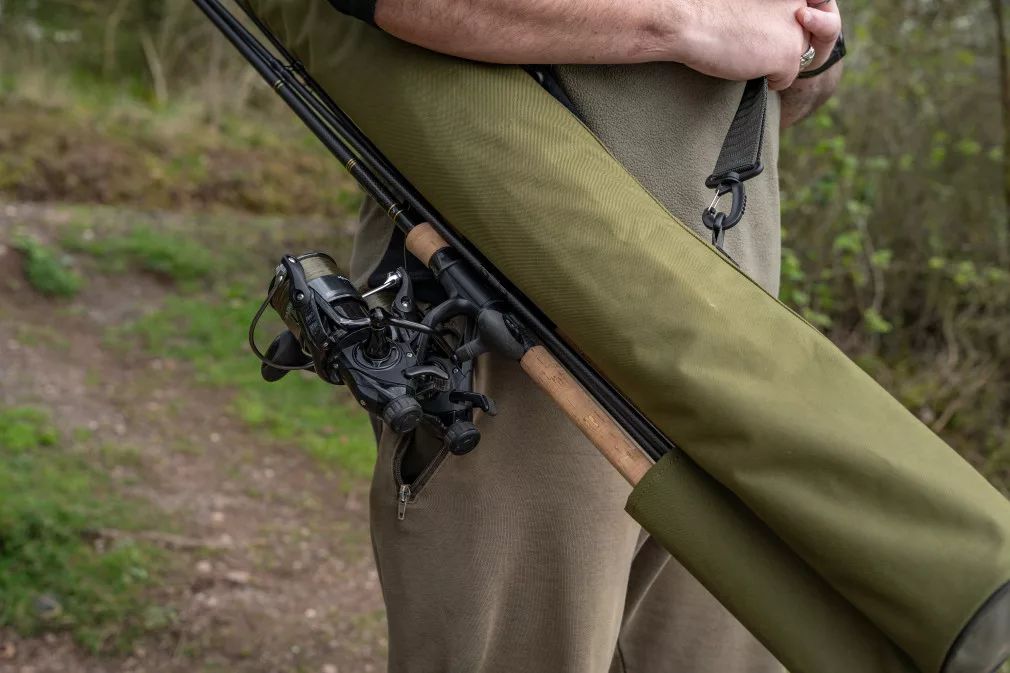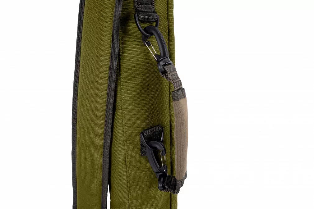 The compact size of the rod bag allows for comfortably fitting two rods, while providing sufficient internal capacity for brollies. The roll-top closure of the main compartment provides extra security and prevents the bag's contents from getting wet or falling out. The removable and adjustable padded shoulder strap ensures comfortable transport, reducing strain and discomfort during long walks. Dimensions: 130x10x9cm