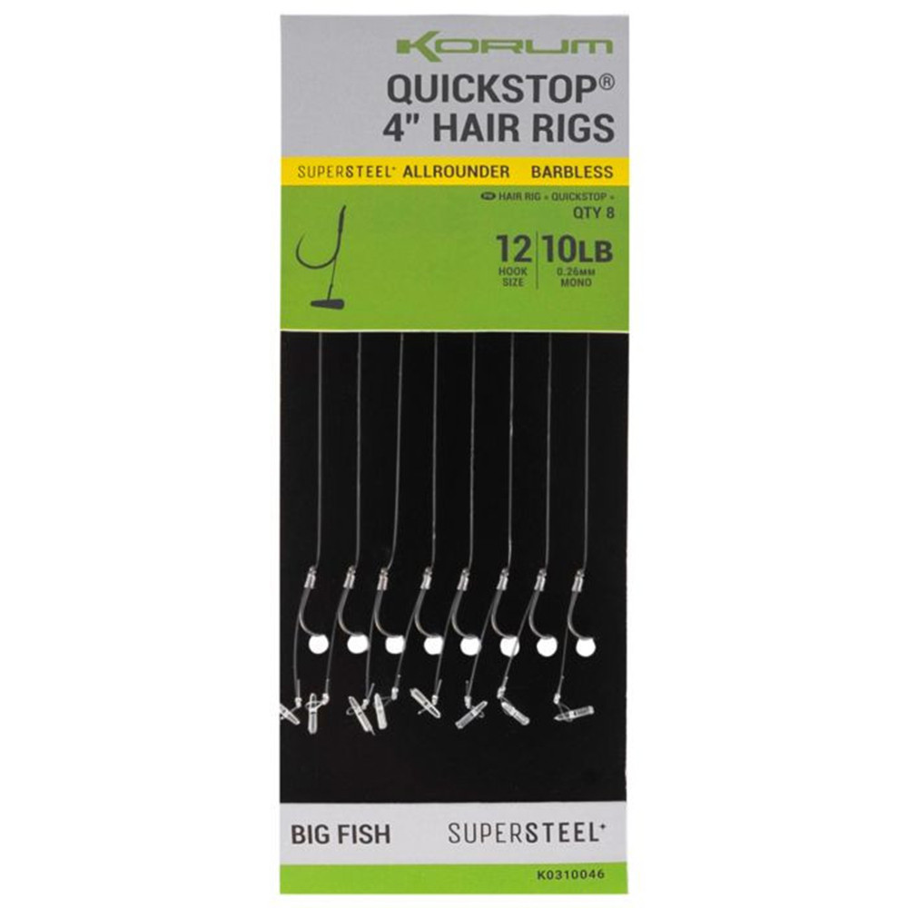 The Korum 4' Big Fish Hair Rigs W Quickstops is a high-quality pre-tied fishing hook set designed specifically for big fish angling. The set contains 8 pieces of 10cm long monofilament pre-tied hooks, all of which are size 14, eyed and barbed. The product features a Quickstop function, which makes bait placement easier and faster.