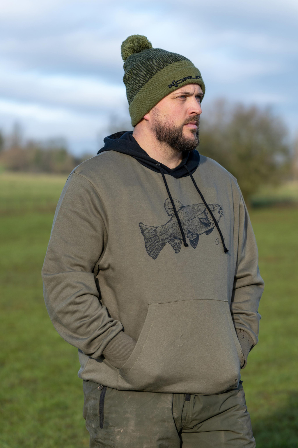The Korum Classic Tench Hoodie is an ideal choice for fishing because it provides comfortable, warm, and breathable wear during hours spent by the water. The hood offers extra protection against wind or light rain, and the elastic cuffs help retain body heat. The hoodie's cut ensures freedom of movement, so it does not hinder handling rigs or changing positions. It also stands its ground as everyday wear, but it is especially recommended for those who want to stylishly showcase their commitment to fishing.