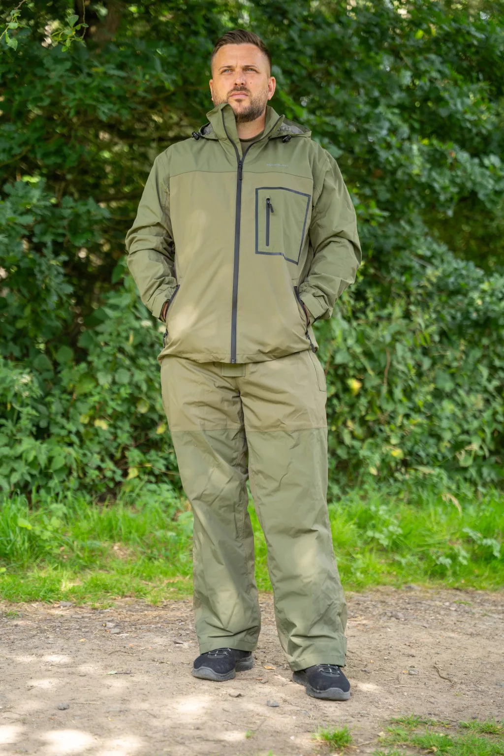 The set is made of modern, waterproof, and breathable material that effectively keeps precipitation out. The jacket and bib and brace trousers are available in multiple sizes, so every angler can find the right fit for them. The adjustable straps and comfortable cut allow for a personalized fit, which is especially important during long, active fishing sessions.