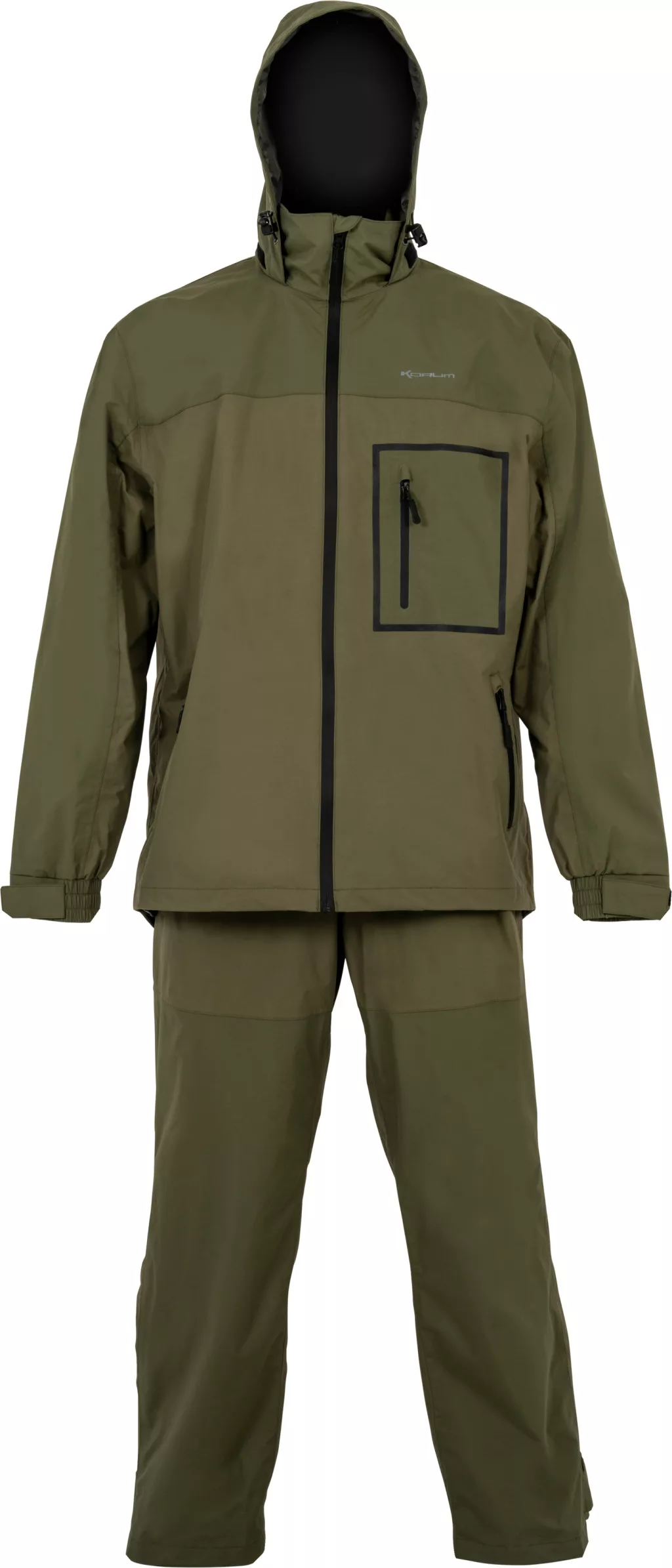 The Korum Superseal Waterproof Suit is a rainwear set specifically designed for anglers' needs. It provides reliable protection against changeable weather, keeping the wearer dry and comfortable during long, stalking fishing trips. The set consists of two parts: a waterproof jacket and Bib&Brace overtrousers, which together provide comprehensive protection against rain, wind, and cold.