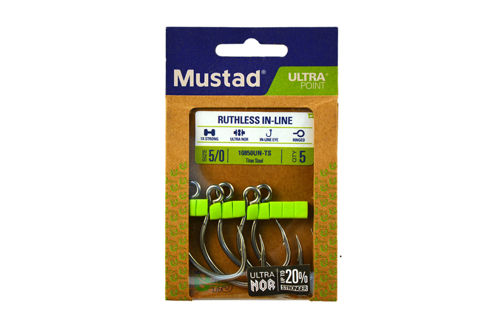 Package includes:Mustad Ruthless In-Line Titan Steel 3/0 Eyed, Barbed Hook 5pcs