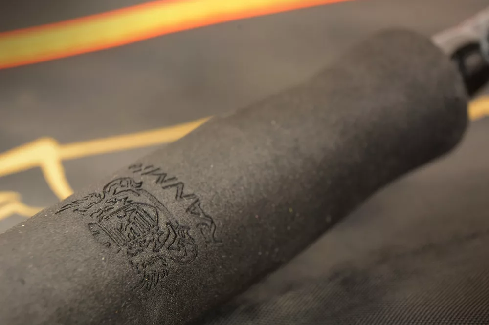 On its aesthetic gold-accented blank, a top-screw, carbon-decorated reel seat is located.